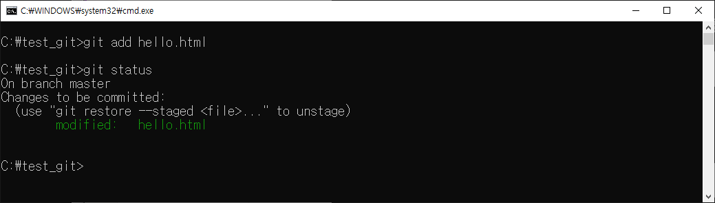 git add로 변경된 내용을 추가 후 git status로 확인하자.