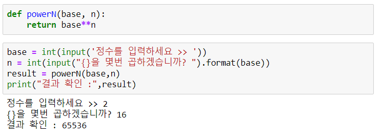 - 2개의 정수 base, n을 입력받아 base의 n제곱만큼 값을 반환하는 powerN()