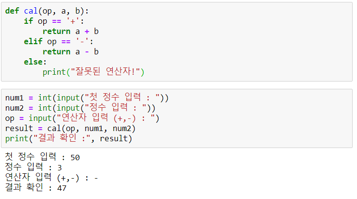 - 2 개의 정수와 연산자(+, -)를 입력 받아 연산 가능한 cal 함수 만들기