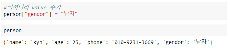 - {'name':['k','y','h']}와 같이 list도 넣을 수 있다.